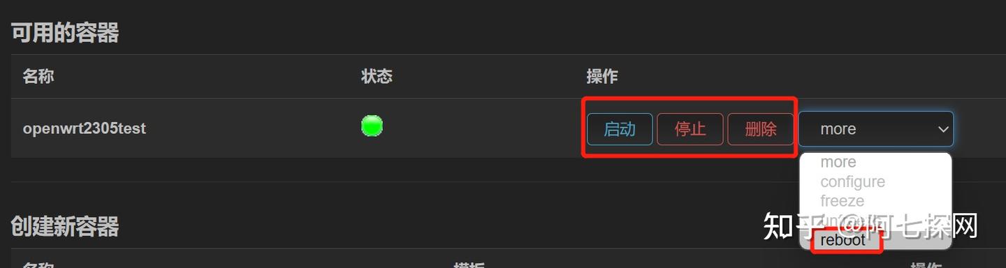 保存配置文件后,我们就可以通过界面对容器进行启动、停止、重启等操作,目前非自编译固件是不是支持冻结操作的,还记得前面安装结果检测里面那个红色的mission吗?