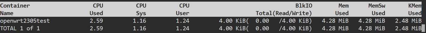 我们通过lxc-top命令来看看资源占用,什么也没装的OpenWrt容器只占用了4M内存,惊不惊艳: