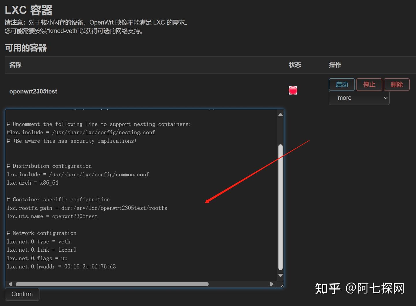 通过LXC管理界面,可以看到LXC的配置文件: